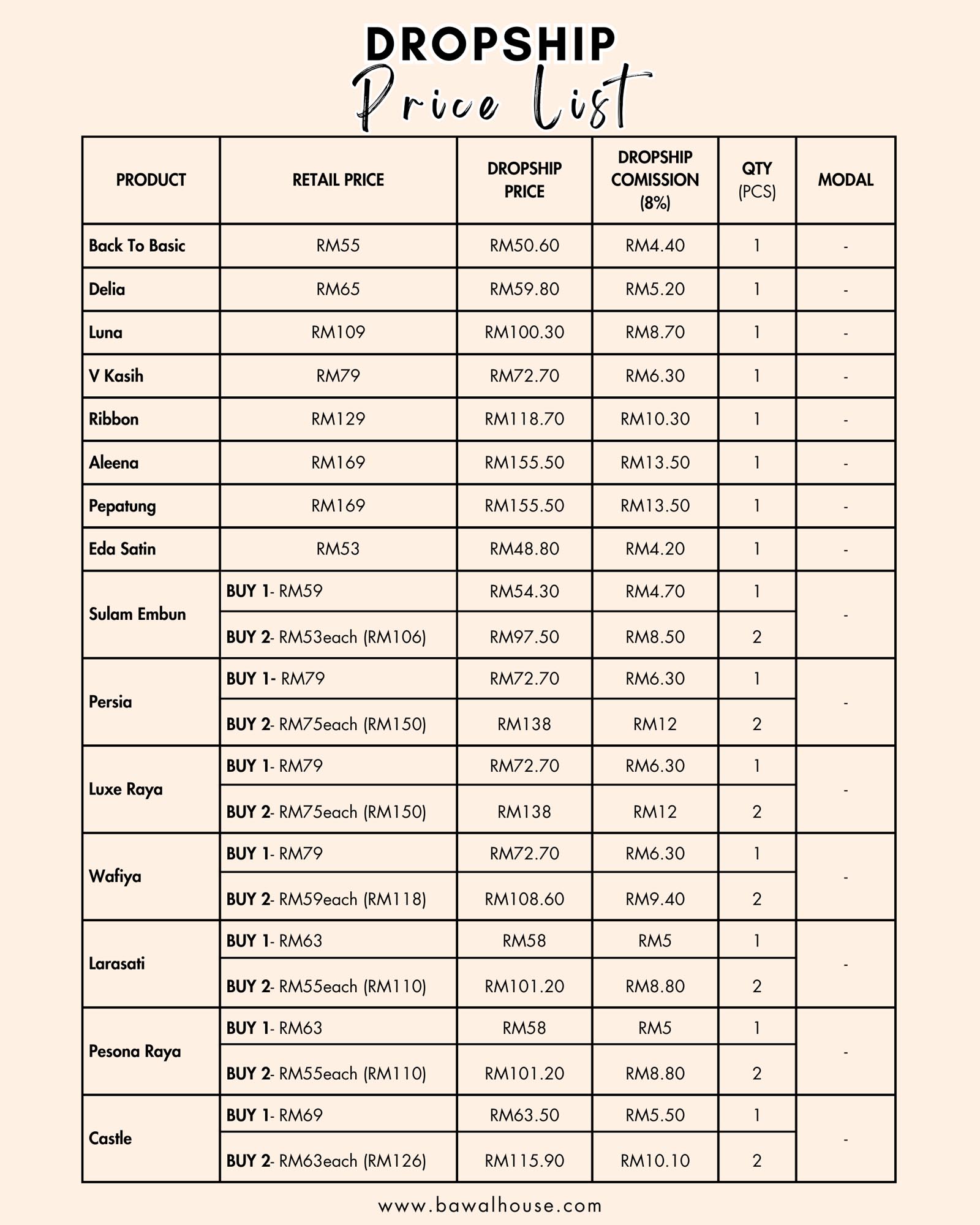 BENEFIT/ KEBAIKAN DROPSHIP BAWAL HOUSE HQ ✔ Belian tudung pertama pada Harga Dropship ✔Sistem order yg pantas ✔Postage pada hari yang berikutnya ✔Tak perlu pegang stok ✔Tak perlu pos barang ✔Tak perlu tanggung risiko stok habis ✔Promote sahaja ✔Bahan marketing disediakan ✔Keahlian Seumur hidup ✔Komisen yg tinggi , bergantung koleksi ✔Reward Tiada kelas coaching diadakan. Pihak kami hanya menyediakan bahan utk marketing , selebihnya usaha dari Cik/puan sendiri Usaha yg gigih inshaAllah ada hasilnya